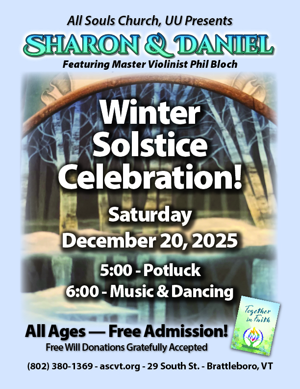 Winter Solstice Celebration Saturday December 20thPotluck and Music Join us as we celebrate the return of light on the darkest night of the year. We will start with a potluck at 5 PM, followed by music and dancing with our own Daniel and Sharon, with featured master violinist Phil Bloch. This event has become an annual tradition at All Souls and ...read more