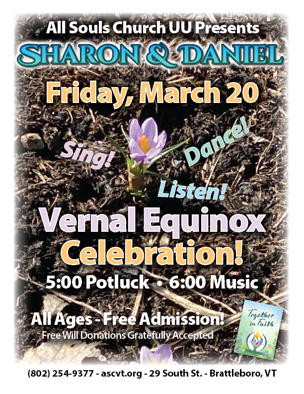 Winter Solstice Celebration Saturday December 20thPotluck and Music Join us as we celebrate the return of light on the darkest night of the year. We will start with a potluck at 5 PM, followed by music and dancing with our own Daniel and Sharon, with featured master violinist Phil Bloch. This event has become an annual tradition at All Souls and ...read more